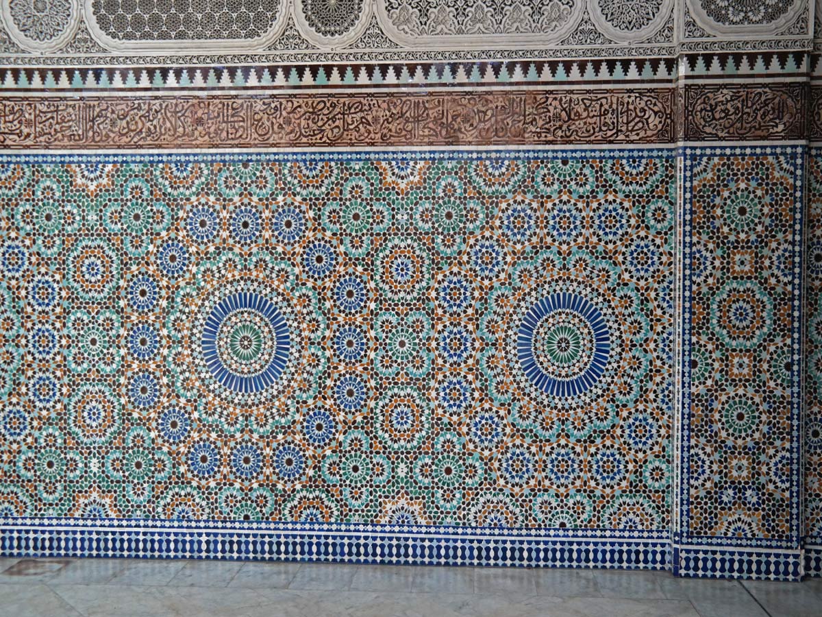 Vous pourrez admirer les zelliges, magnifiques mosaïques caractéristiques de l’art islamique, qui ornent les murs de ce patio. Nous nous arrêterons quelques instants devant l’imposante porte en bois de cèdre à l’entrée de ce patio. Celle-ci est une œuvre rare fabriquée à la main par des artisans marocains et qui est ornée de versets du Coran en calligraphie coufique.